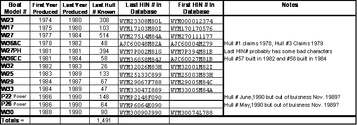 Hull Numbering: Early Watkins 36C’s had hull numbers that begin with AJC standing for Auroraglas Company until July 1982. Afterwards the hull #’s begin with WYM standing for Watkins Yacht & Marine, Inc which was the original name of the Co prior to purchase by the McLaughlin Body Co. Watkins continued the serial #’s rather than starting over at zero when they changed the Manufacturers Identification Code (MIC) to WYM. Likewise the 36 center cockpit and 36 aft cockpit models share a common serial number sequence so that hull #36 might be a center cockpit and hull #37 might be an aft cockpit. Several other models used common serial #'s. The W27 and W27PH used one set of serial numbers. Also the W29/30 used a continuous serial number sequence as they converted over from making the older W29 to the newer W30 which is a W29 with a reverse transom; the serial number sequence was continued. The exception to the rule is the W32/W33. The hull numbers were restarted at #1 for the W33 model possible due to the extent of the redesign.