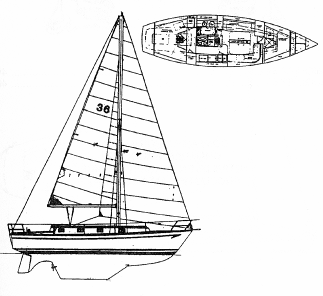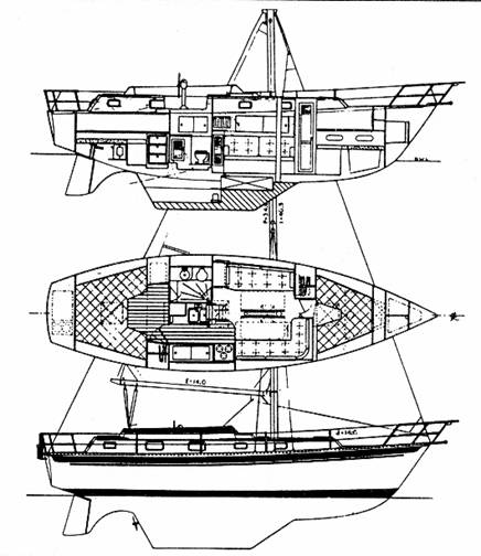 H U L L & D E C KThe hull is molded as a single unit of a combination of polyester resin and fiberglass woven roving and multidirectional chopped strand fiber (MCSF). The keel is molded integrally with the hull and all ballast is contained inside. The deck and cockpit, like the hull, are molded as a single unit of a combination of polyester resin and fiberglass woven roving and MCSF. Plywood coring is incorporated between layers of fiberglass in the cabin top, deck, seat, and cockpit sole areas to give additional stiffness. The non-skid finish is molded into the deck. The exterior finish is pigmented gelcoat molded onto the fiberglass. The boot stripe is also tinted gelcoat molded permanently into the hull. R U D D E R & S T E E R I N GThe rudder is made by Foss Foam, molded as two fiberglass halves, the hollow stainless steal rudder post welded to blades is placed inside and the assembly is filled with a high density foam. The rudder is mounted to a full skeg for strength. S P A R S & R I G G I N GAll spars (mast, boom, and spreaders) are extruded aluminum 6061-T6 alloy, with a protective coating an all external surfaces. The masts has a single spreader, and booms with single reefing. After 1984 the mast and boom were made by Isomat. The main sheet traveler is mounted on the cabin top. Two dual speed winches control the genoa sheets. I N T E R I O RThe interior is a molded fiberglass unit with bulkheads and cabinetry fastened to it with screws, bolts, and adhesives. The interior molded assembly is bonded to the hull with woven roving and mat, that when completed, forms a single unit structure having great strength and rigidity. The headliner is made of soft perforated vinyl with teak trim. The interior is finished with hand rubbed teak accents and the bulkheads and cabinetry is teak veneered plywood. Early models had a carpeted cabin sole but later models were teak and holly veneered plywood. The interior layout is typical with a V-berth forward, the head is aft and connects to both the salon and the owners stateroom. The galley is aft in the passageway to the owners state room. The galley is equipped with refrigerator, 3 or 4 burner propane stove with eye level oven and double sink. The stairs removes to allow access to the engine on the center cockpit model or tilts up on the AC model. A U X I L A R YA 40 horse power Perkins diesel engine was standard equipment on the early models with a Perkins 50 horse power model #4108 on the later models.. E L E C T R I C A L .S Y S T E M Standard configuration unknown Last updated 04/22/2007